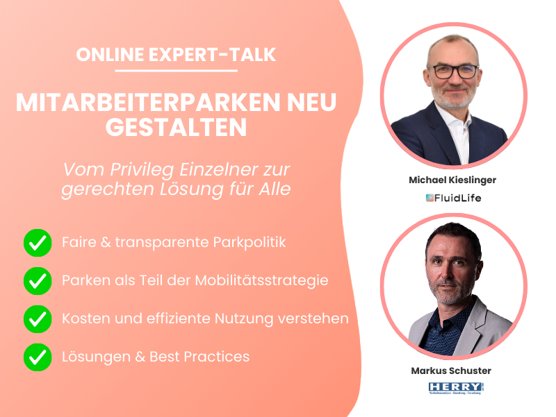 Erfahre im Expert Talk, wie Mitarbeiterparken vom umstrittenen Privileg zu einer fairen, transparenten und zukunftsfähigen Lösung wird. Gemeinsam mit Markus Schuster von Herry Consult diskutieren wir, wie moderne Parkpolitik Kosten senkt, Konflikte entschärft und deinem Unternehmen konkrete Ansätze bietet, um Parken strategisch neu zu gestalten.